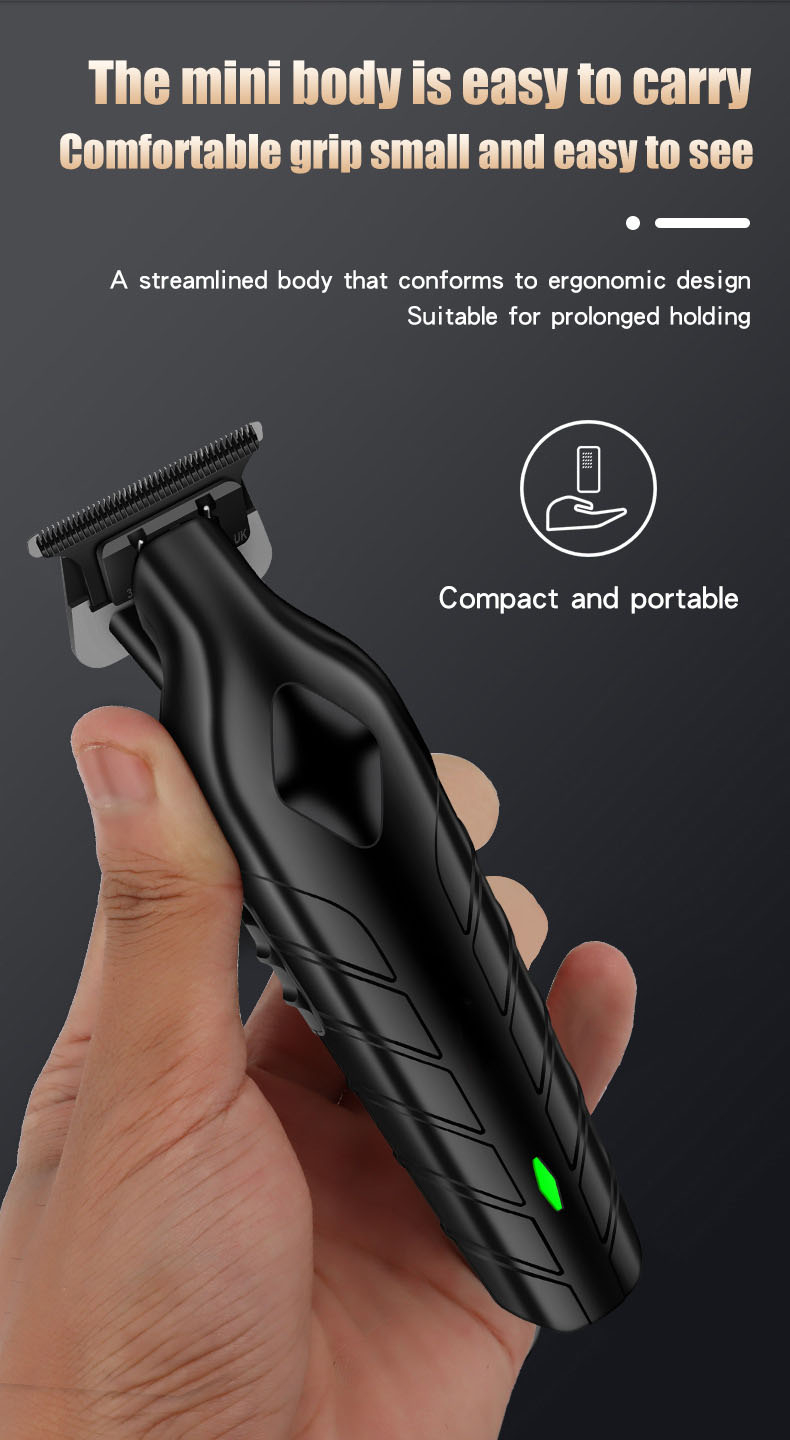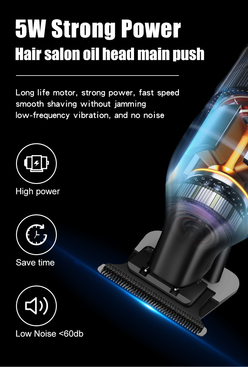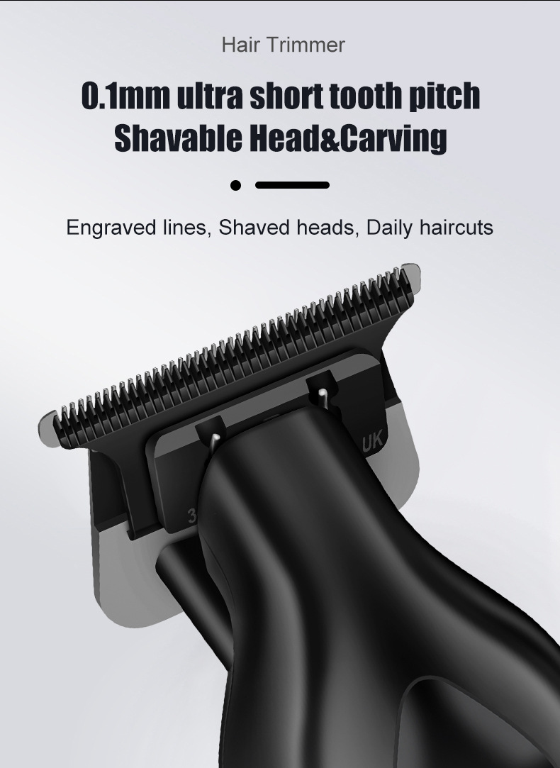 Professional cordless hair clipper for slick back, fades, and carving styles. Features precision steel blade, 600mAh battery for 120 minutes use, 2-hour USB fast charging, and quiet ≤55dB operation. Perfect for oil head and detailed trimming.